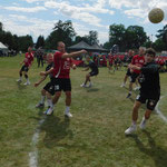 Auf zwei bestens hergerichteten Rasenplätzen wurde Handball gespielt. Auf eigens errichteten Tribünen hatten die Zuschauer einen besten Blick auf das Geschehen. Vormittags fanden Jugendspiele statt, nachmittags gingen dann 8 Erwachsenen-Teams auf Tore- und Punktejagd. Der HV Artern hatte die weiteste Anreise. Der Spaß stand im Vordergrund, der Flachs blühte auf dem grünen Rasen. Der SV Behringen/Sonneborn stellte auch ein Mixteam aus Frauen und Männern, mit Bernd Hübner, dem Trainer der ersten Männermannschaft im Tor. Aufgrund zeitgleich stattfindender anderer Veranstaltungen war Landesmeister ThSV Eisenach II nur mit kleinem Kader angereist, doch das Team um Spielertrainer Qendrim Alaj fand sich auf ungewohntem Terrain gut zurecht. Kempa-Treffen, auch in doppelter Ausführung, gehörten wie in der Halle zum Repertoire. „Ja, das wollen wir sehen“, riefen die Zuschauer angetan von der Tribüne. In der Turnier-Auftaktpartie gegen die in Bestbesetzung aufgelaufene 1. Mannschaft des SV T & C Behringen/Sonneborn (u.a. mit Neuzugang Felix Gärtner im Tor, Tim Rodrian, Hannes Meyer, Björn Harder) lag der ThSV Eisenach II zunächst 1:4 hinten, startete in der Folge zum erfolgreichen Gegenstoßspiel, führte 11:8, leistete sich dann aber mehrere Holztreffer. Tim Rodrian glich noch zum 14:14 aus. In den Folgepartien zeigte sich der ThSV Eisenach II ausgesprochen torhungrig (23:11 gegen das Mixteam, 26:9 gegen die Dritte des SV Behringen/Sonneborn) und warf sich damit ins Halbfinale. In diesem, gegen die starke Zweite des SV Behringen/Sonneborn, fiel die Entscheidung im Siebenmeter-Werfen, das der ThSV Eisenach II knapp mit 6:5 für sich entschied. Keeper Christian Trabert glich mit Glanzparaden die Fehlwürfe seiner Teamkollegen aus. Spannend ging es auch im Finale zu, das der ThSV Eisenach II knapp mit 15:14 über eine Auswahl des Thüringer Handballverbandes (u.a. mit Sascha Kleint, Christopher Kohls, Florian Schneegaß und Mirko Brachmann) für sich entschied. Im vereinsinternen kleinen Finale bezwang die Erste die Zweite des SV Behringen/Sonneborn im Siebenmeter-Werfen.